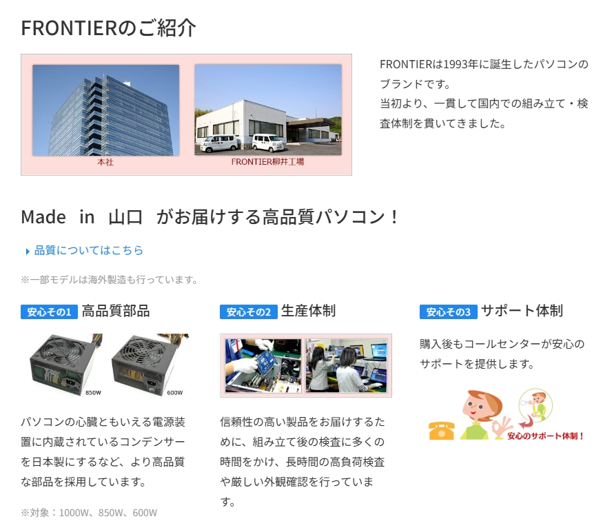 FRONTIERは、山口県に自社工場を持つ日本のPCメーカーで、BTOパソコンの老舗ブランドとして知られています。大手メーカーと比べてもコストパフォーマンスが高く、特にゲーミングPCや動画編集PCに強いという声が多く見られます。