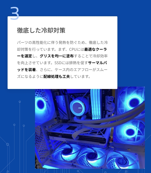 CPUやグラフィックボード、メモリ容量、ストレージ、電源ユニットなどを細かく選べるため、自分に最適な構成でPCをオーダー可能。